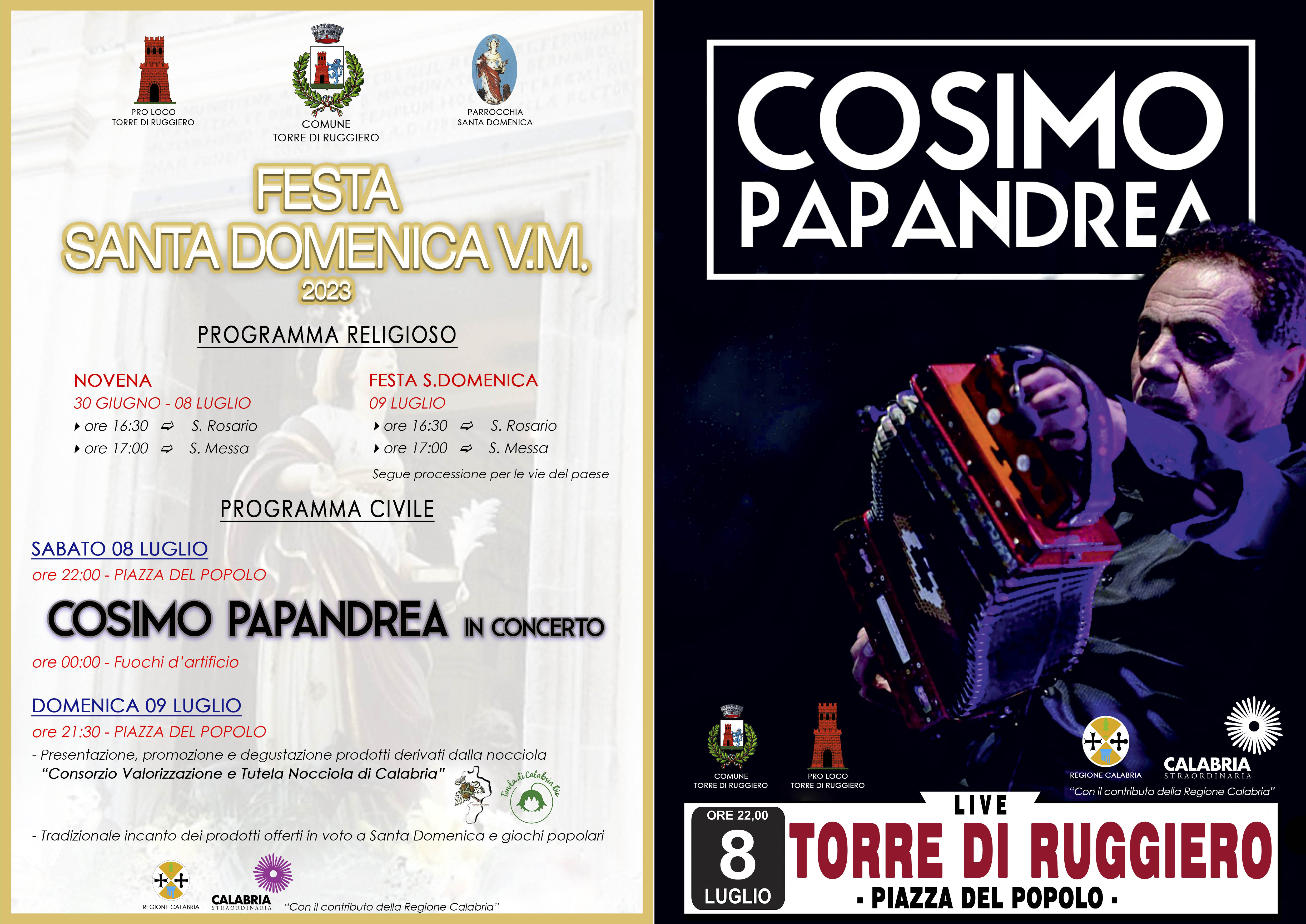 - Domenica 09 luglio in Piazza del Popolo dalle ore 21:30 presentazione, promozione e degustazione prodotti derivati dalla nocciola del nostro territorio, con la presenza del "Consorzio Valorizzazione e Tutela Nocciola di Calabria", incanto dei prodotti offerti in voto a Santa Domenica e giochi popolari